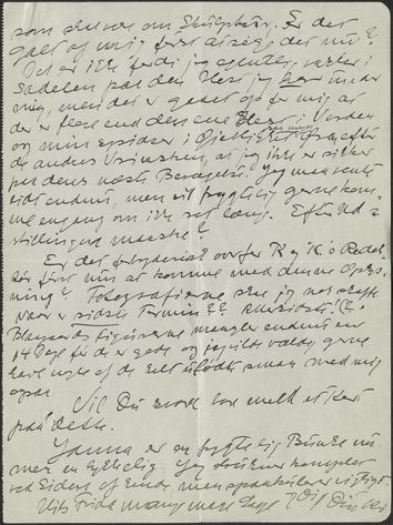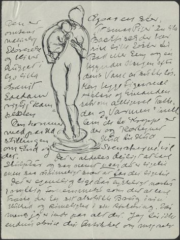 Det er aldeles dejligt at lave Skulptur og saa nemt naar det er ligetil men saa urimeligt svært at faa det ligetil. Det er egentlig lige saa lykkeligt næsten i nyttig Fornemmelse som det at lave Træsko, der har sit absolutte Brug i sin Hulhed og Rimelighed i sin Afskæring. Hør mens jeg er inde paa alt det. Jeg tør ikke endnu skrive den Artikkel om mig selv