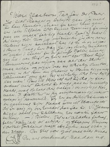 som skal være om Skulptur. Er det galt af mig først at sige det nu? Det er ikke fordi jeg egentlig vakler i Sadelen paa den Hest jeg har under mig, men det er gaaet op for mig at der er flere end den ene Hest i Verden og min spidser i Øjeblikket |saa meget| Øren efter de andres Vrinsken, at jeg ikke er sikker paa dens næste Bevægelse. Jeg maa vente lidt endnu, men vil frygtelig gerne komme engang om ikke ret længe. Efter Udstillingen maaske?