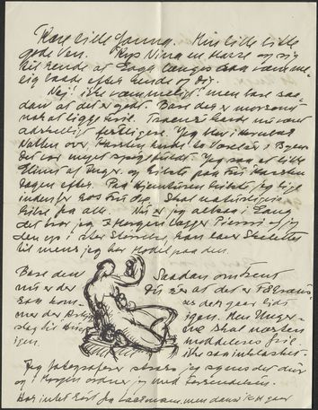 Nej! ikke væmmeligt! men bare saadan at det er godt. Bare det er morsomt nok at ligge Ferie. Troense havde nu været adskilligt festligere. Jeg blev i Hornbæk Natten over, Karsten havde to Værelser i Byen. Det var meget spøgefuldt. Jeg saa et lille Glimt af Inger og hilste paa Fru Karsten Dagen efter. Paa Hjemturen kikte jeg lige indenfor hos Fru OH. Skal naturligvis hilse fra alle. Nu er jeg altsaa i Gang det tror jeg. I Morgen lægger Pierri og jeg den op i stor Størrelse, han laver Skelettet til mens jeg har Model paa den.