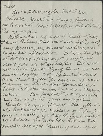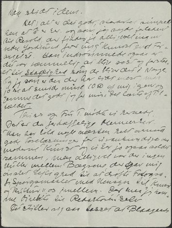 Alt i alt er det godt, storartet simpelthen at I er her, og som jeg sagde forleden til Revold, der findes jo alligevel ingen bedre Jordbund for ung Kunst end Forargelse. Han indrømmede ogsaa at det var væmmelig at blive rost og forstaaet til Stadighed som de bliver det i Norge. Og jeg som er den der har lidt mest, maa jo se se at smide mine 10 Pund af mig igen og gemme det godt jeg for min Del lærte af Tilfældet.