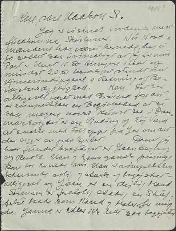 Jeg er vistnok Verdens mest fuldkomne Skørlevner. Nu Nordmændene har været hernede, har vi jo soldet saa urimeligt at jeg for min Part er blevet 10 Pund tungere i Fedt og mindst 20 Pund besværligere rundt om Hjernevindingene i Retning af Bevægelsesdygtighed. Men. Det har alligevel været med Grund for det er simpelthen en Begivenhed at se saa megen norsk Kunst her i Danmark og det er en Vinding af høj Værd at snakke med Folk oppe fra Jer om det der ligger en paa Hjertet. Dem jeg har fundet kraftigst er Jean Hejberg og Revold. Han og hans ganske purunge Kone bor hernede nu. Han er simpelthen bedaarende rolig og stærk og begejstret alligevel, og Jean er en dejlig Mand. Sørensen er foreløbig stadig en Skuffelse baade som Mand og Maler for mig da. Janna er heller ikke helt saa begejstret